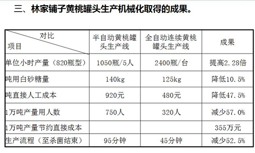林家鋪?zhàn)狱S桃罐頭生產(chǎn)機(jī)械化取得的成果如下表(以下圖片由林家鋪?zhàn)?010年當(dāng)年采購使用后做的對(duì)照表):