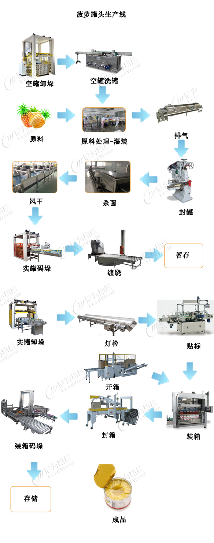 尼為為您提供全套的菠蘿罐頭生產(chǎn)線設(shè)備,菠蘿通過預(yù)處理、調(diào)味后,需要進(jìn)行裝罐、真空密封、殺菌、貼標(biāo)、裝箱、全自動碼垛機(jī)。這樣既保持了菠蘿的口感又解決了菠蘿的儲存問題。
